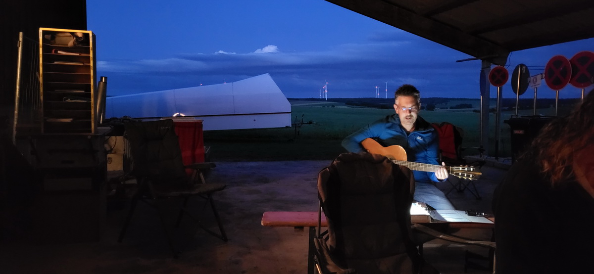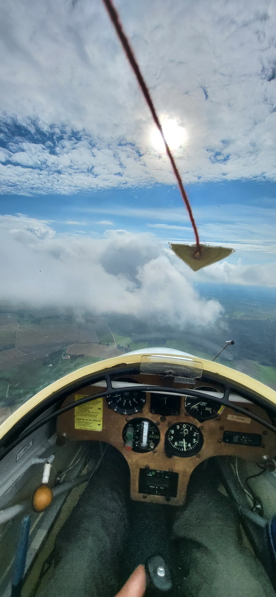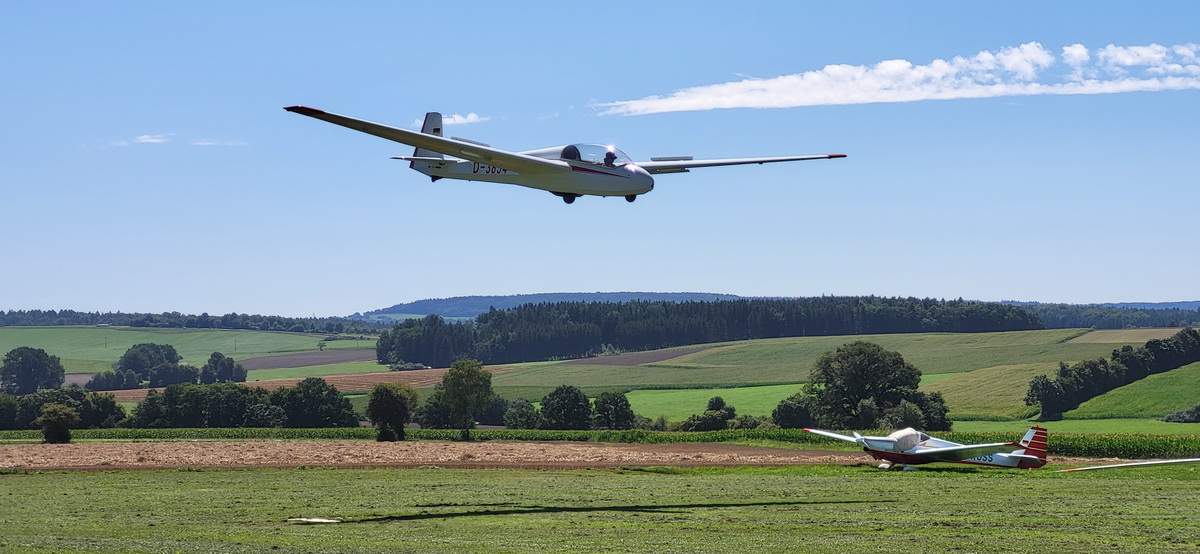 04.08.25 Es ist mal wieder ziemlich kalt. Flugbetrieb ist erst ab 1330 möglich, weil die Wolkenuntergrenze quasi nicht vorhanden ist und wir ziemlich im Nebel sitzen. Nur Maxi, der uns besucht hatte, startet schon recht früh und mogelt sich zwischen den Wolkenschwaden zurück nach Hause. Selbst am Nachmittag war die Basis nicht höher als 280m GND, also nicht ideal zum F-Schlepp – doch die Challenge wurde angenommen! Ab 17 Uhr wurde es merkbar wärmer und in gleichem Maße ist auch die Basis angestiegen auf 500m. So gab es einen langen Flugtag, denn die letzten Stunden wurden wurden bis zum Schluss ausgenutzt.
