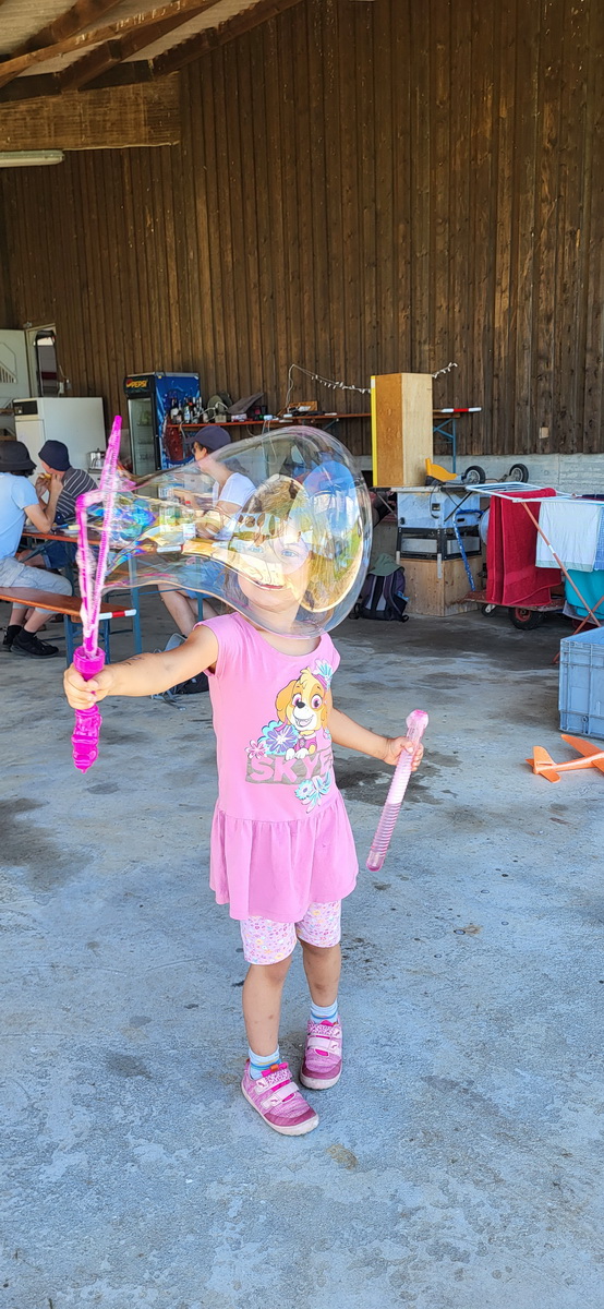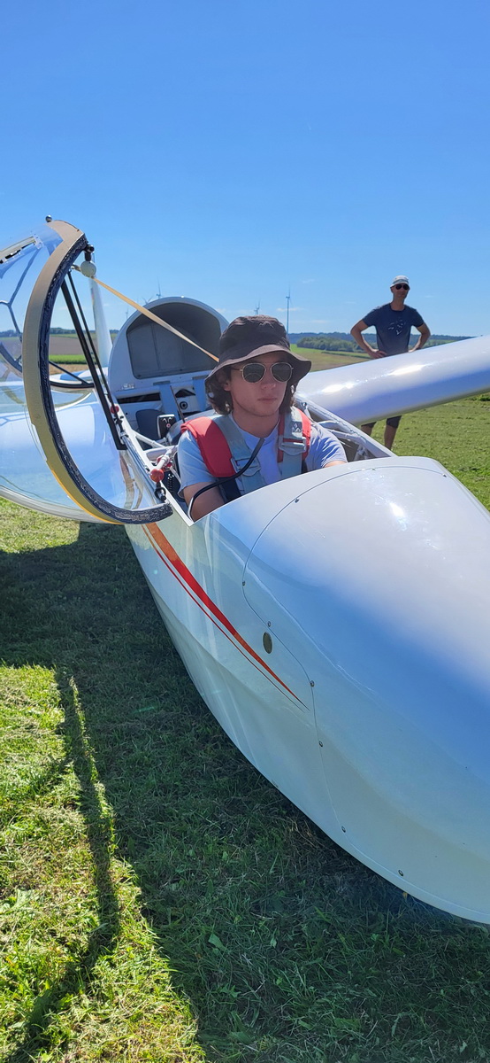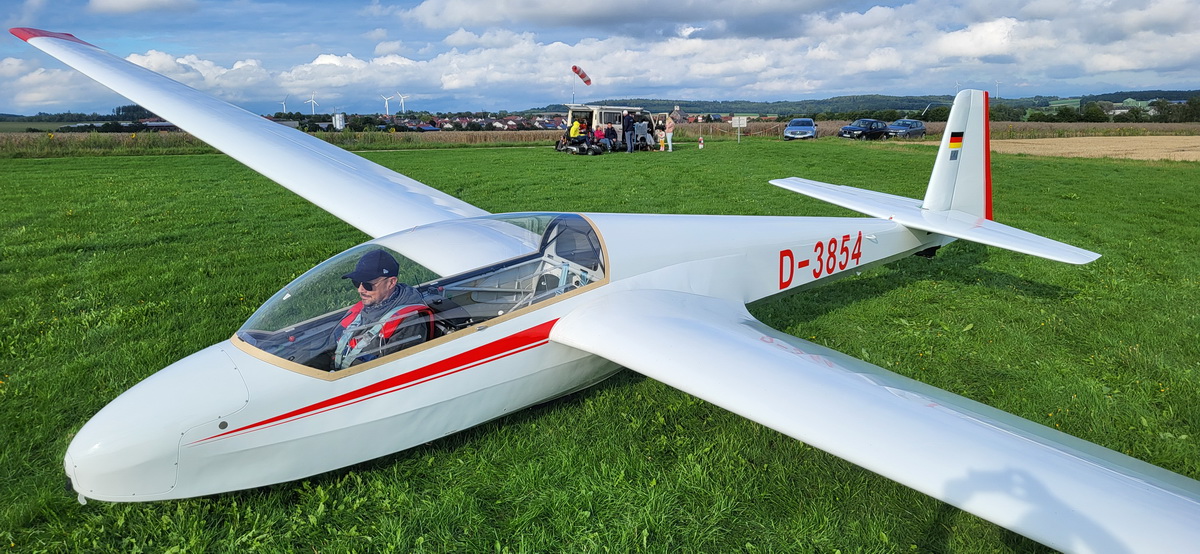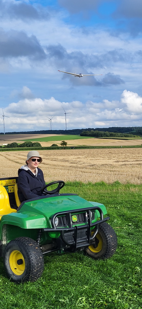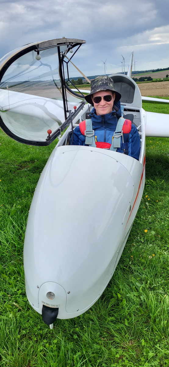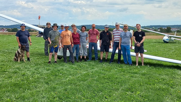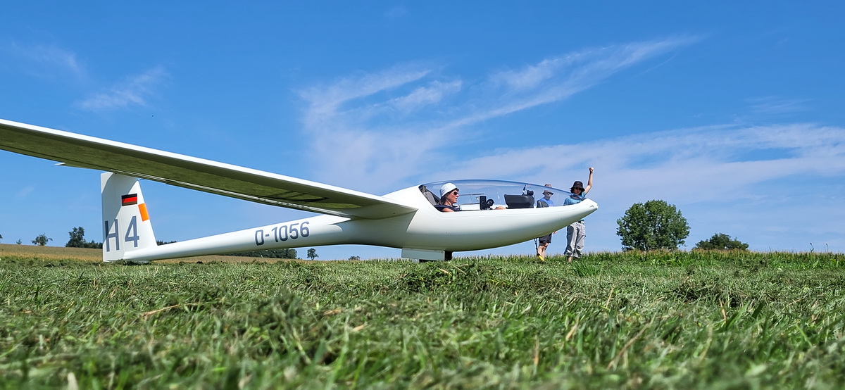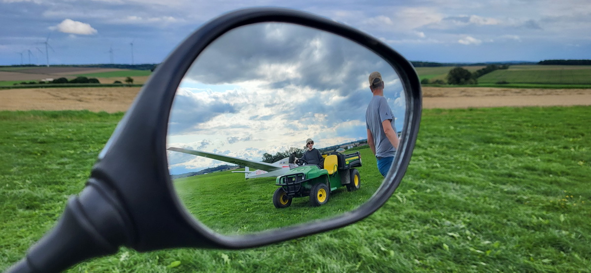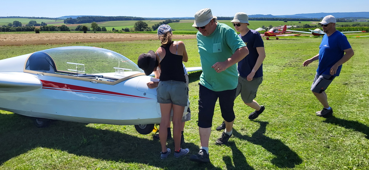 03.08.25 Endlich! Morgens ist es zwar immer noch stark bewölkt und die Wolken hängen tief, doch die Überführung klappt weil gegen späten Vormittag sich das Wetter verbessert und so ohne Risiko die 70km abgeflogen werden können. Die Flugcrew wird schon sehnsüchtig erwartet – und so können am Nachmittag noch drei Schulstarts absolviert werden. Dann schlägt leider wieder der Regen zu und nur noch vereinzelt wird die Mücke bewegt.